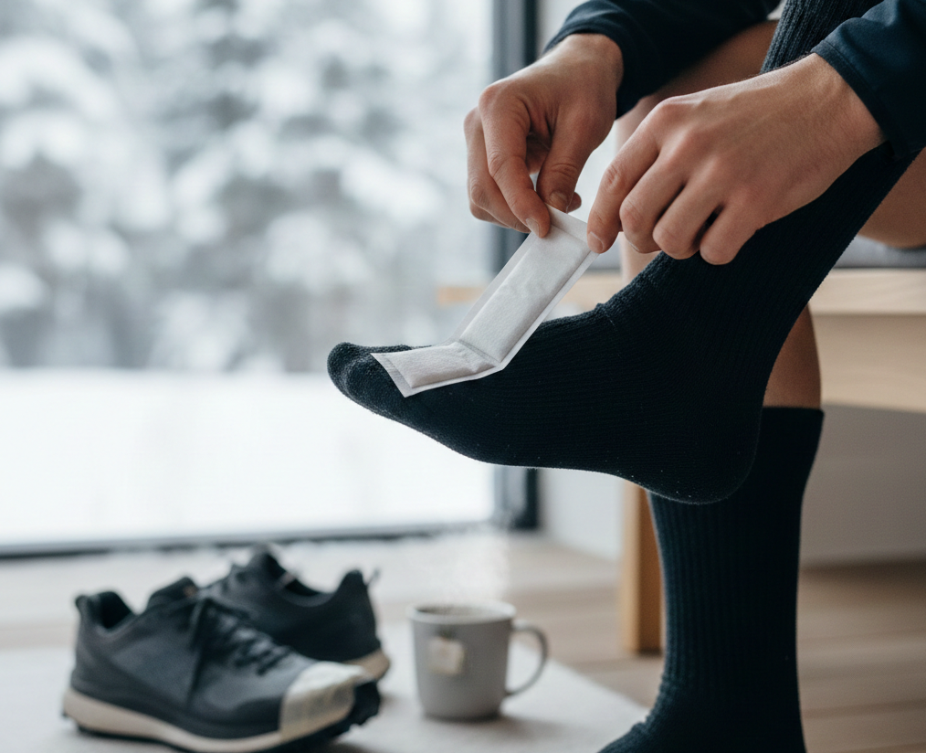 발 시려움을 가장 빠르게 해결해주는 아이템은 바로 **발끝 전용 핫팩**입니다. 하지만 잘못된 위치에 붙이면 이물감과 압박감으로 러닝에 방해가 됩니다.